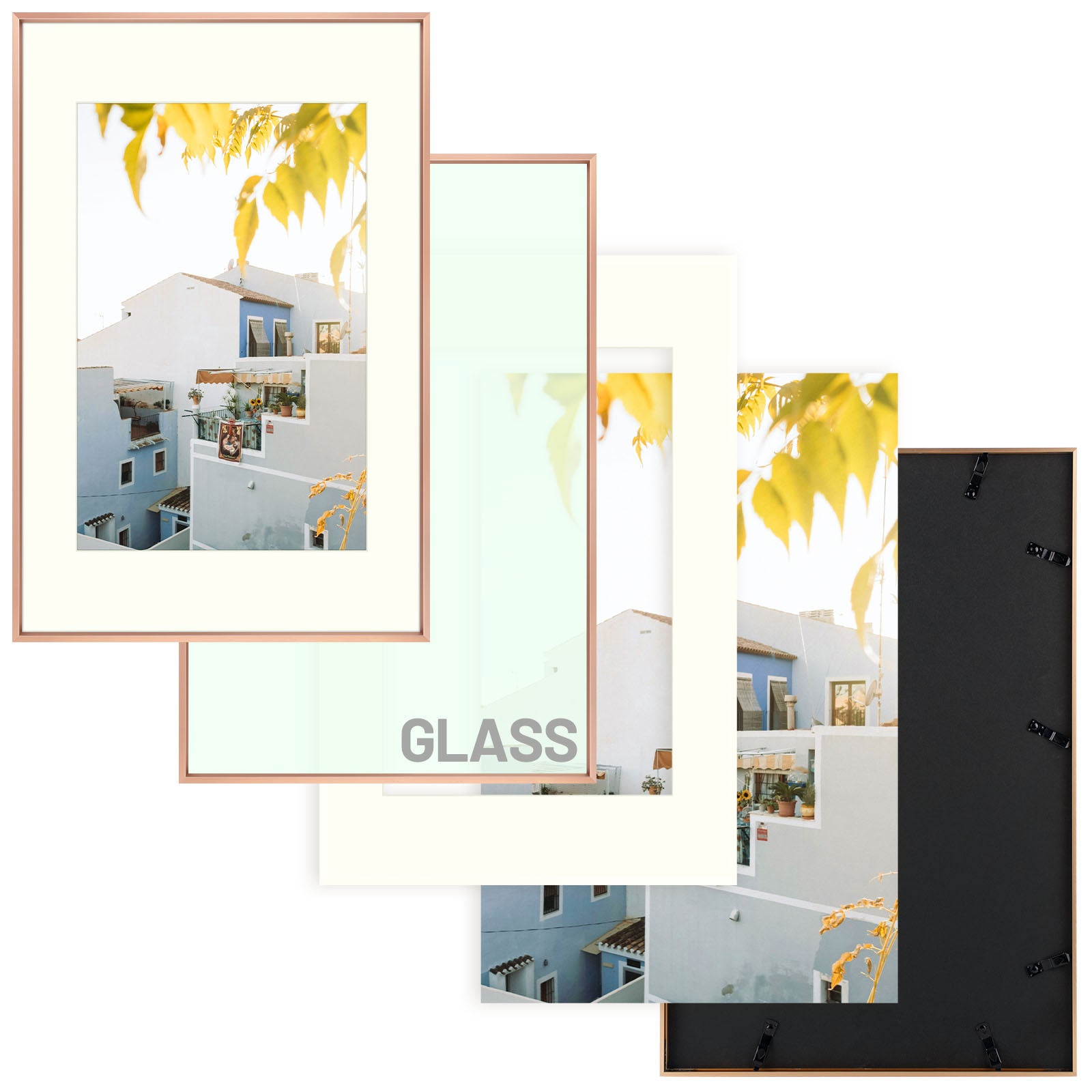 • One 16x24 rose gold aluminum frame with real glass front.